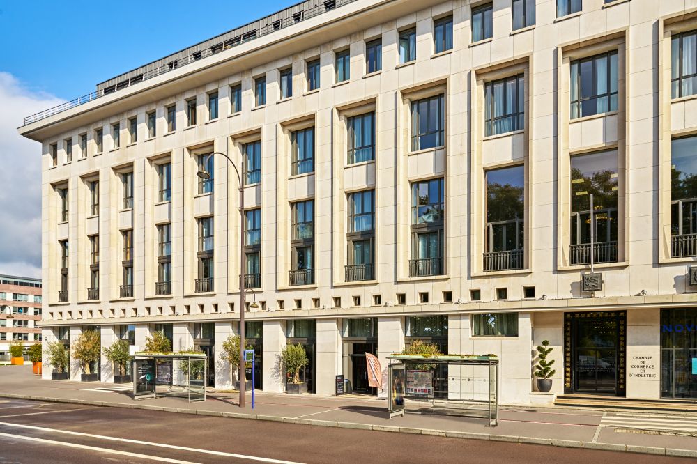 Anchored on the banks of the Seine, in the heart of the historic city of Rouen. Completely redesigned and rebuilt within the historic walls of the Palais des Consuls, a building dating back to 1954 and classified as a protected monument, our hotel offers a modern and daring design, preserving the original architecture while integrating decorative elements inspired by Art Deco and Kinetic Art from the 1950s. A stone's throw away, the majestic Notre-Dame Cathedral, dating back to the 11th century, towers over its medieval quarter and represents a masterpiece in the transition from Romanesque to Gothic art. Claude Monet, a neighbor of Rouen from his garden in Giverny, immortalized this cathedral in a series of 30 famous paintings, showcasing the light and beauty of the Normandy region. Welcome to Normandy, at the gates of the Boucles de la Seine Regional Natural Park, in the heart of timeless history and beauty.egional Natural Park, in the heart of the city and centuries of history. In your hotel, where you will find the restaurant dedicated to the art of living and eating in the French way, in the centre of Normandy and its legendary savoir vivre. 82 rooms await you, your bar, your swimming pool, your gym, and meeting rooms.